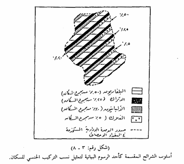 وهناك طريقة بيانية أخرى يمكن اعتبارها طريقة مطورة، ولكن بشكل عن طريقة المستطيلات البيانية المقسمة تعرف باسم الشرائح (الشرائط) المقسمة Divided. Strips ويمكننا تبسيط اجراءات تنفيذ هذه الطريقة لتمثيل البيانات الخاصة بالتركيب العرقي للسكان على النحو التالي فإذا فرض وكان لدينا توزيعاً في صورة نسب مئوية لمختلف المجموعات الجنسية لمتصل سكاني معقد وأردنا تمثيله على أساس الوحدات الادارية فإن نسبة كل مجموعة جنسية في كل وحدة يمكن توقيعها على الخريطة الأساسية التي تظهر عليها حدود الوحدات الادارية بعد تقسيم المساحة الكلية لكل وحدة ادارية منها إلى شرائح مائلة باتساع متساو بحيث تمثل كل شريحة من الشرائح المتجاورة على 100% ويمكن تقسيمها بالتالي لتصور التركيب العرقي في الوحدة الادارية.