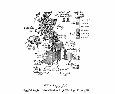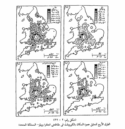 1- يحول عدد كل مجموعة إلى نسب مئوية من مجموع عدد المهاجرين من المحافظة أو المقاطعة في تلك السنة، أو بعبارة أخرى ينسب عدد كل مجموعة إلى المجموع الكلى لهذه المجموعات، ثم توقع كل نسبة في المحافظة أو المقاطعة الخاصة بها، ويختار لها فئات مناسبة للتظليل المساحي (الكوروبلث) ، ويجب أن تلفت النظر هنا إلى عدم تظليل المحافظة أو لا مقاطعة التي هاجرت منها هذه المجموعات بحيث تترك خالية من التظليل وكتابة اسمها فقط لداخل المساحة التي تشغلها.