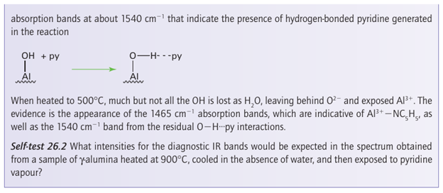 Key point: Surface acids and bases are highly active for catalytic reactions such as the dehydration of alcohols and isomerization of alkenes. When exposed to atmospheric moisture, the surface of γ-alumina is covered with adsorbed water molecules. Dehydration at 100 to 150°C leads to the desorption of water, but sur face OH groups remain and act as weak Brønsted acids: