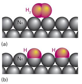 Figure 26.16 Schematic representation of (a) physisorption and (b) chemisorption of hydrogen and a nickel metal surface.