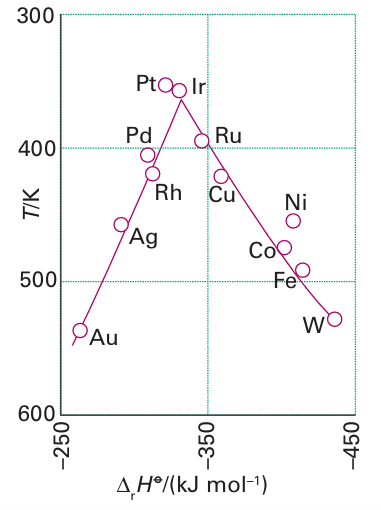 Figure 26.17 A volcano diagram. In this case the reaction temperature for a set rate of methanoic (formic) acid decomposition plotted against the stability of the corresponding metal methanoate as judged by its enthalpy of formation. (Based on W.J.M. Rootsaert and W.M.H. Sachtler, Z. Phyzik. Chem. 1960, 26 16.)