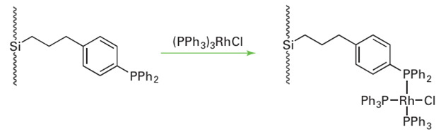Key point: The tethering of a catalyst to a solid support allows easy separation of the catalyst with little loss in catalyst activity. One popular technique has been the tethering of a homogeneous catalyst to a solid support. Thus, a hydrogenation catalyst such as Wilkinson’s catalyst can be attached to a silica surface by means of a long hydrocarbon chain: