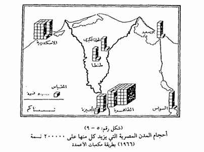 ويشيع استخدام طريقة مجمعات الأعمدة المكعبة بكثرة في تمثيل توزيع سكان المدن والتي تتميز بعظم تركيزها المكانى كما يظهر من الشكل رقم (5 - 9) الذي يوضح توزيع سكان بعض المدن المصرية التي زيد عدد سكان كل 200000 نسمة عام 1966.
