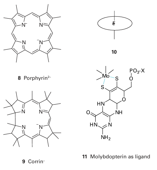 Key point: Metal ions may be bound in proteins by special organic ligands such as porphyrins and pterin-dithiolenes. The porphyrin group (8) was first identified in haemoglobin (Fe) and a similar macrocycle is found in chlorophyll (Mg). There are several classes of this hydrophobic macrocycle, each differing in the nature of the side chains. The corrin ligand (9) has a slightly smaller ring size and coordinates Co in cobalamin (Section 27.11). Rather than show these macro cycles in full, we shall use shorthand symbols such as (10) to show the complexes they form with metals. Almost all Mo and W enzymes have the metal coordinated by a special ligand known as molybdopterin (11). The donors to the metal are a pair of S atoms from a dithiolene group that is covalently attached to a pterin. The phosphate group is often joined to a nucleoside base X, such as guanosine 5-phosphate (GMP), resulting in the formation of a diphosphate bond. Why Mo and W are coordinated by this complex ligand is unknown, but the pterin group could provide a good electron conduit and facilitate redox reactions.