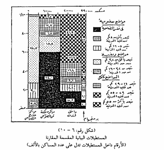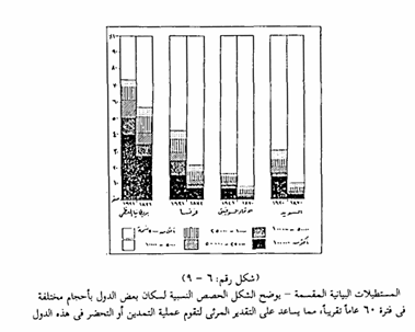 تتشابه طريقة المستطيلات البيانية المقسمة في تمثيلها لكميات الظاهرة وعناصرها مع طريقة الأعمدة البيانية المركبة (المقسمة) التي تستخدم في توضيح التغيرات في التركيب العمراني ممثلة في الأوضاع الريفية والحضرية للسكان ، فمثلاً الشكل رقم (6 - 9) يمثل مجموعة من المستطيلات البيانية المقسمة التي توضح من مقارنتها حالة وتقدم التمدين في بعض الأقطار الأوربية في الفترة من 1870 - 1930 ونلاحظ أن هذا الرسم قد استلزم مفتاحاً بيانياً له وهو الأمر الأفضل بدلاً من كتابتها على المستطيل أو بجواره ، ومثل هذا النوع من الرسوم البيانية يستخدم كمؤشر للتمدين والذى تم تطبيقه بفاعلية كبيرة في دراسة النمو المدنى للسكان فى انجلترا وويلز (1967 ,Law).