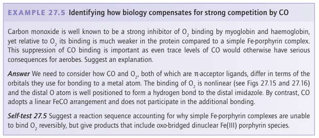 Key point: Proteins binding O2 reversibly do so by preventing its reduction and eventual O-O bond cleavage. This protection is difficult to achieve with small molecules. Certain elaborate macrocyclic Fe (II) complexes exhibit reversible O2 binding by providing steric hindrance to attack on the coordinated O2. Much effort has been spent on synthesizing simple complexes that coordinate O2 reversibly and could be used as blood substitutes in special circumstances, such as emergency surgery. The problem is that although O2 reacts with d-block metal ions to form complexes in which the O−O bond is retained (as in superoxo and peroxo species), these products tend to undergo irreversible decomposition involving rapid O−O bond cleavage and formation of water or oxides. Overcoming this problem requires complexes designed to protect the coordinated O−O ligand, preventing it from reacting further. Sterically hindered Fe(II) complexes such as the ‘basket’ porphyrin (22) achieve this protection by preventing a second Fe(II) complex from attacking the distal O atom of the superoxo species to form a bridged peroxo intermediate. As we shall see in Section 27.10, peroxo complexes of Fe (III) tend to undergo rapid O−O bond proteolysis, resulting in formation of H2O and Fe(IV) O.