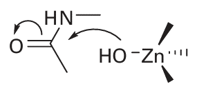 Key point: Zinc is well suited for catalysing acid–base reactions as it is abundant, redox inactive, forms strong bonds to donor groups of amino acid residues, and exogenous ligands such as H2O are exchanged rapidly. A Zn2 ion has high rates of ligand exchange and its polarizing power means that the pKa of a coordinated H2O molecule is quite low. Combined with strong binding to proteinlig ands, rapid ligand exchange (coordinated H2O or substrate molecules), a reasonably high electron affinity, flexibility of coordination geometry, and no complicating redox chemistry, Zn is well suited to its role in catalysing specific acid–base reactions. The large family of Zn enzymes include carbonic anhydrase, carboxypeptidases, alkaline phosphatase, -lactamase (responsible for penicillin resistance in bacteria), and alcohol dehydrogenase. Typically, the Zn is coordinated by three amino acid ligands (in contrast to zinc fingers, which have four) and one exchangeable H2O molecule (14). The mechanisms of Zn enzymes are normally discussed in terms of two limiting cases. In the Zn-hydroxide mechanism, the Zn functions by promoting deprotonation of a bound water molecule, so creating an optimally positioned OH nucleophile that can go on to attack the carbonyl C atom: