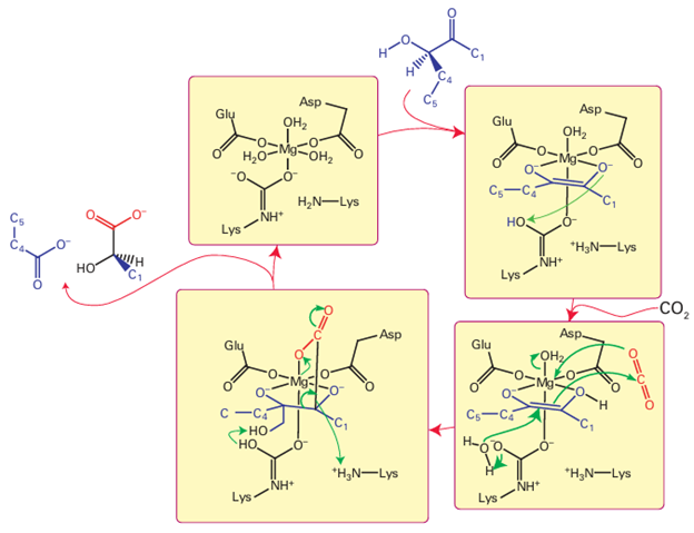 Figure 27.31 Mechanism of action of ribulose 1,5-bisphosphate carboxylase, the enzyme responsible for removing CO2 from the atmosphere and ‘fixing’ it in organic molecules in plants.