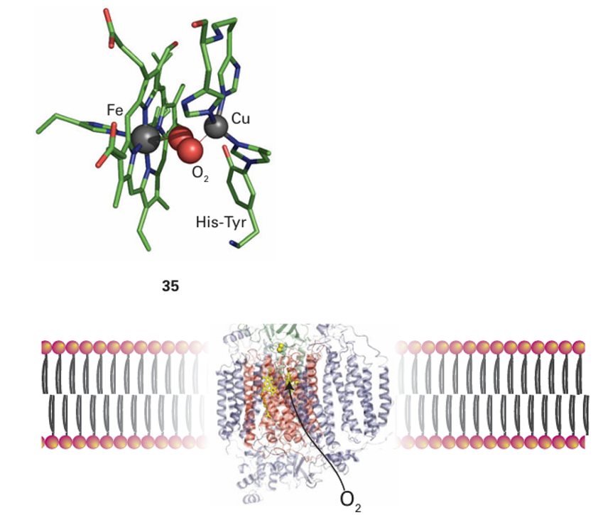 This reaction includes four H that are not consumed chemically but are ‘pumped’ across the membrane against a concentration gradient. Such an enzyme is called an electrogenic ion pump (or proton pump). In eukaryotes, cytochrome oxidase is located in the inner membrane of mitochondria and has many subunits (Fig. 27.35), although a simpler enzyme is produced by some bacteria. It contains three Cu atoms and two haem-Fe atoms, as well as a Mg atom and a Zn atom. The Cu and Fe atoms are arranged in three main sites. The active site for O2 reduction consists of a myoglobin-like Fe-porphyrin (haem-a3) that is situated close to a ‘semi-haemocyanin-like’ Cu (known as CuB) coordinated by three histidine ligands (35). One of the histidine imidazole ligands to the Cu is modified by for mation of a covalent bond to an adjacent tyrosine. Electrons are supplied to the dinuclear site by a second Fe porphyrin (haem-a) that is six-coordinate, as expected for an electron transfer centre. These centres are located in subunit 1. Subunit 2 contains the dinuclear CuA centre that was described in Section 27.8, which is believed to be the immediate acceptor of the electron arriving from cytochrome c. The electron transfer sequence is therefore