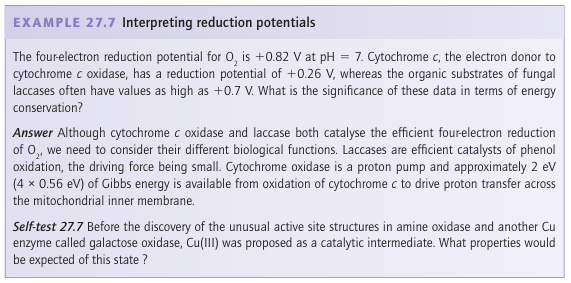 in plants and fungi, from which they are secreted to catalyse the oxidation of phenolic substrates. The active site at which O2 is reduced (37) is well buried. It contains a pair of Cu atoms linked in the oxidized form by a bridging O atom, with a third Cu atom situated very close by, completing an almost triangular arrangement. Amine oxidases catalyse the oxidation of amines to aldehydes by using just a single Cu atom that shuttles between Cu(II) and Cu(I), yet the enzyme carries out a two-electron reduction of O2 , producing a molecule of H2O2 . The problem is overcome because, like cytochrome c peroxidase and cytochrome c oxidase, amine oxidases have an additional oxidizing source located near to the metal, in this case a special cofactor called topaquinone (TPQ), which is formed by post-translational oxidation of tyrosine (38).