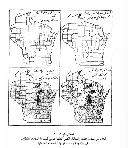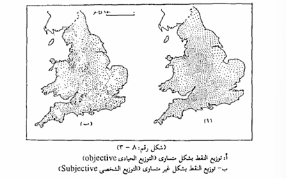 وعندما نختار طريقة النقط كرمز موضعى لرسم خريطة توزيعات، فإن إنشاء مثل هذه الخريطة يتطلب توافر الاحصاءات الخاصة بالظاهرة المراد توزيعها موزعة حسب الوحدات الإدارية في المنطقة المراد دراستها، ثم خريطة أساسية للمنطقة توضح عليها هذه الوحدات التي ستوقع عليها نقط التوزيع وتجدر الإشارة هنا إلى أنه كلما كانت الاحصاءات موزعة على أساس الوحدات الأصغر مساحة مثل رسم الشياخات والتوابع ، كلما كان الاخراج النهائي للخريطة دقيقاً وأقرب إلى الحقيقة والواقع. وتبدأ عملية خريطة النقط باختيار مدلول كمي يناسب الكميات التي نريد تمثيلها بيانياً على الخريطة، وذلك لأن تمثيل مفردات الظاهرة بعدد من النقط يماثل عددها الفعلى يعد استخدام الرموز التصويرية في الطريقة الكوروسكيمائية، أو بعبارة أخرى يجب أن تستخدم تظليلاً غير متدرجاً وألواناً متباينة، أي أننا لسنا بحاجة إلى استخدام من الأمور المستحيلة تقريباً ومن هنا كان علينا تمثيل عدد معين من مفردات الظاهرة بنقطة واحدة، وبذلك نتغلب على ما سينجم من توزيع كل المفردات من ازدحام الخريطة بالنقطة بشكل تنعدم معه الفائدة . من الخريطة أن وبعد يتم تحديد المدلول الكمى للنقطة نختار حجماً مناسباً للنقطة والذي سوف يتوقف على مقياس رسم الخريطة الأساسية التي ستوقع عليها النقط، وعدد النقط التي ستوقع على الخريطة، والطرق المتاحة لرسم النقط من حيث توفر ريش التنقيط Dotting-Pens. ولاشك أن هناك علاقة بين مدلول النقطة ومساحة النقطة، وأن التوفيق بينهما يؤدى في النهاية إلى اخراج خريطة في أنسب صورة ممكنة ويمكن الاستعانة بالرسم البياني التقنيني -Nomo graph الذي ابتكره ماكاي عام 1949 1969 ,Robinson) في تحديد العلاقة بين قيمة النقطة ومساحة النقطة اللذين ترغب في استخدامهما ويتم توقيع النقط على الخريطة بحيث يتلاءم توزيعها مع الشكل الحقيقي الذي تتضح به في الطبيعة فليس من المعقول أن نوزع النقط الخاصة بمحصول معين يزرع في أرض معينة بالصحراء الشرقية أو الغربية المصرية مثلاً دائماً ملتزم بالشريط الزراعي الذي يحف بنهر النيل، ولكن الأمر يستلزم فحص الخرائط الطبوغرافية وخرائط استخدام الأرض قبل توزيع النقط على الخريطة الأساسية ومن هنا يعد حل مشكلة توقيع النقط داخل حدود الوحدة المساحية التي توزع فيها أكثر صعوبة من حل مشكلتى المدلول الكمى للنقطة ومساحة النقطة وفي هذا الصدد نجد أن هناك حلين متعارضين أولهما يختص بتوزيع النقط بشكل متساوى داخل كل مساحة الوحدة الإدارية، أي يكون التوزيع حيادياً Objective حيث يكون معروضاً دون أن يتأثر بحكم أو رى الكارتوجرافي. والحل الآخر يتضمن توزيع النقط بشكل غير متساوى بحيث تصبح النقط ممثلة بقدر الامكان للتباين والاختلاف الحقيقي في التوزيع، أي يصبح التوزيع ذاتياً أو شخصياً Subjective حيث يتأثر بالحكم الشخصى للكارتوجرافي الذي يأخذ في اعتباره العوامل المختلفة عن محاولته تمثيل واظهر التوزيع الجغرافي للظاهرة على الخريطة العرض الكارتوجرافي ينقل بوضوح تفاصيل مواقع وتوزيع الظواهر الجغرافية الاقتصادية، كما أنه يعطى لقارئ الخريطة انطباعاً مرئياً لتباين الكثافة بطريقة واضحة سهلة الفهم - رغم ما قد يصحب ذلك من خداع بصري نتيجة تأثر العين بعدد وترتيب النقط التي تحيط بمساحة توزيع معينة.