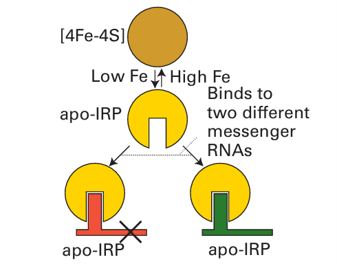 Key point: Organisms use sophisticated regulatory systems based on Fe-containing proteins to adapt quickly to changes in cellular concentrations of Fe and O2. We have already seen how FeS clusters are used in electron transfer and catalysis (Sections 27.8 and 27.9). The coordination of an FeS cluster ties together different parts of a protein and thus controls its tertiary structure. The sensitivity of the cluster to oxygen, electrochemical potential, or Fe and S concentrations makes it able to be an import ant sensory device. In the presence of O2 or other potent oxidizing agents, [4Fe 4S] clusters have a tendency (controlled by the protein) to degrade, producing [3Fe 4S] and [2Fe 2S] species. The cluster may be removed completely under some conditions (Fig. 27.48). The principle behind an organism’s exploitation of FeS clusters as sensors is that the presence or absence of a particular cluster (the structure of which is very sensitive to Fe or oxygen) alters the conformation of the protein and determines its ability to bind to nucleic acids. In higher organisms, the protein responsible for regulating Fe uptake (transferrin) and storage (ferritin) is an FeS protein known as the iron regulatory protein (IRP), which is closely related to aconitase (Section 27.9) but is found in the cytoplasm rather than in mitochondria. It acts by binding to specific regions of messenger RNA (mRNA) that carry the genetic command (transcribed from DNA) to synthesize transferrin receptor or ferritin. A specific interaction region on the RNA is known as the iron-responsive element (IRE). The principle is outlined in Fig. 27.49. When Fe levels are high, a [4Fe-4S] cluster is present, and the protein does not bind to the IRE that controls translation of ferritin. In this case binding would be a ‘stop’ command, and the cell will respond by synthesizing ferritin. Simultaneously, binding of the [4Fe 4S]-loaded protein to the transferrin receptor IRE destabilizes the RNA, so transferrin receptor is not made. When Fe levels are high, the opposite actions occur: a [4Fe-4S] cluster is formed, ferritin synthesis is activated, and transferrin receptor synthesis is switched off (repressed). The common gut bacterium E. coli derives energy either by aerobic respiration (using a terminal oxidase related to cytochrome c oxidase, Section 27.10) or by anaerobic respiration with an oxidant such as fumaric acid, or nitrate, using the Mo enzyme nitrate