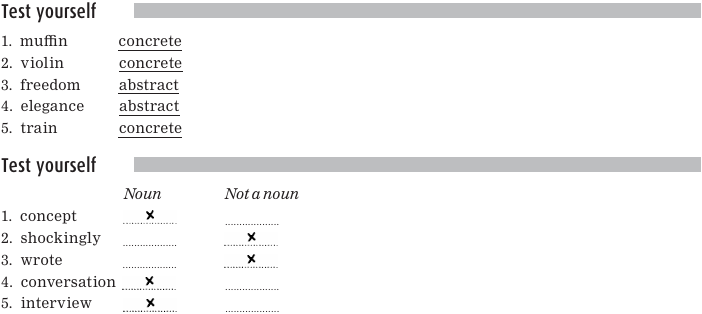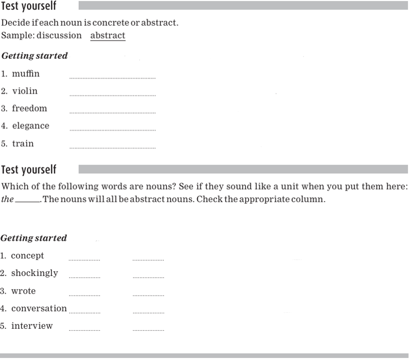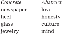 The nouns were all concrete nouns. Other nouns, such as marriage, are abstract; this means that they refer to things that you cannot perceive with your senses, things you cannot see, smell, feel, taste, or touch. Here are some more concrete and abstract nouns: