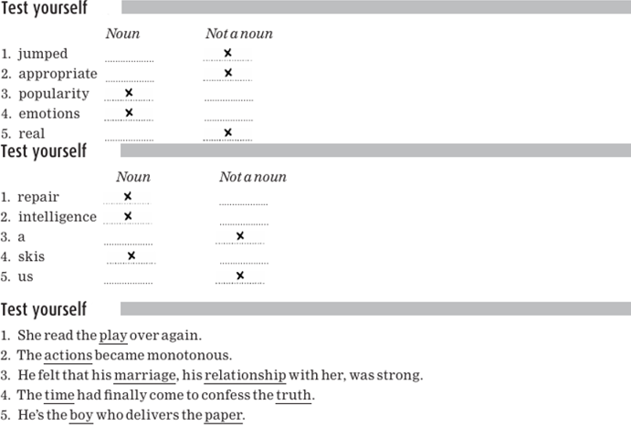 Another easy way to identify a noun, especially an abstract noun, is to put the word his (or other words like it) in front of it and see if it sounds like a unit. For example, his complaint, his happiness, his concern all are units; therefore, complaint, happiness, and concern are nouns.