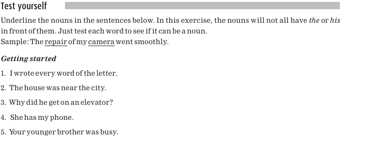 As you can see from these sentences, while the _____ or his ______ are ways to test a word to see if it’s a noun, a noun doesn’t necessarily have the or his in front of it in every sentence.