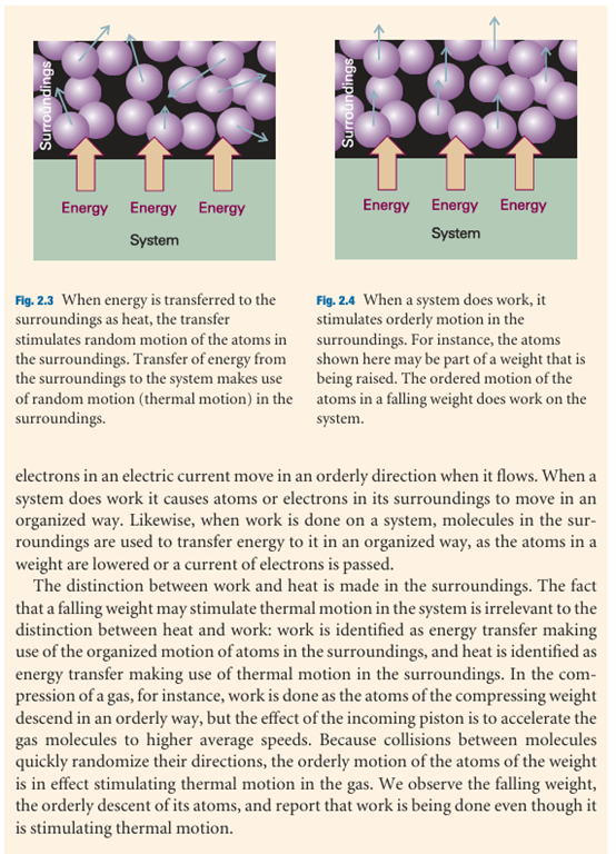 The fundamental physical property in thermodynamics is work: work is motion against an opposing force. Doing work is equivalent to raising a weight somewhere in the surroundings. An example of doing work is the expansion of a gas that pushes out a piston and raises a weight. A chemical reaction that drives an electric current through a resistance also does work, because the same current could be driven through a motor and used to raise a weight. The energy of a system is its capacity to do work. When work is done on another wise isolated system (for instance, by compressing a gas or winding a spring), the capacity of the system to do work is increased; in other words, the energy of the system is increased. When the system does work (when the piston moves out or the spring unwinds), the energy of the system is reduced and it can do less work than before. Experiments have shown that the energy of a system may be changed by means other than work itself. When the energy of a system changes as a result of a tempera ture difference between the system and its surroundings we say that energy has been transferred as heat. When a heater is immersed in a beaker of water (the system), the capacity of the system to do work increases because hot water can be used to do more work than the same amount of cold water. Not all boundaries permit the transfer of energy even though there is a temperature difference between the system and its surroundings. An exothermic process is a process that releases energy as heat into its surroundings. All combustion reactions are exothermic. An endothermic process is a process in which energy is acquired from its surroundings as heat. An example of an endothermic process is the vaporization of water. To avoid a lot of awkward circum locution, we say that in an exothermic process energy is transferred ‘as heat’ to the surroundings and in an endothermic process energy is transferred ‘as heat’ from the surroundings into the system. However, it must never be forgotten that heat is a process (the transfer of energy as a result of a temperature difference), not an entity. An endothermic process in a diathermic container result in energy flowing into the system as heat. An exothermic process in a similar diathermic container result in a release of energy as heat into the surroundings. When an endothermic process takes place in an adiabatic container, it results in a lowering of temperature of the system; an exothermic process results in a rise of temperature. These features are summarized in Fig. 2.2.