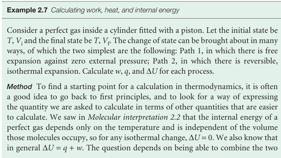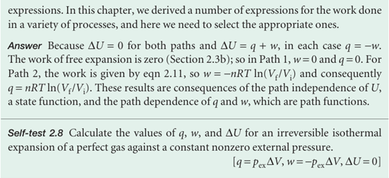 Notice the difference between this equation and eqn 2.38. First, we do not write ∆q, because q is not a state function and the energy supplied as heat cannot be expressed as qf − qi. Secondly, we must specify the path of integration because q depends on the path selected (for example, an adiabatic path has q ≠ 0, whereas a nonadiabatic path between the same two states would have q ≠ 0). This path-dependence is expressed by saying that dq is an ‘inexact differential’. In general, an inexact differential is an infinitesimal quantity that, when integrated, gives a result that depends on the path between the initial and final states. Often dq is written dq to emphasize that it is in exact and requires the specification of a path. The work done on a system to change it from one state to another depends on the path taken between the two specified states; for example, in general the work is different if the change takes place adiabatically and non-adiabatically. It follows that dw is an inexact differential. It is often written pw.