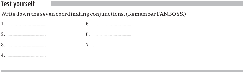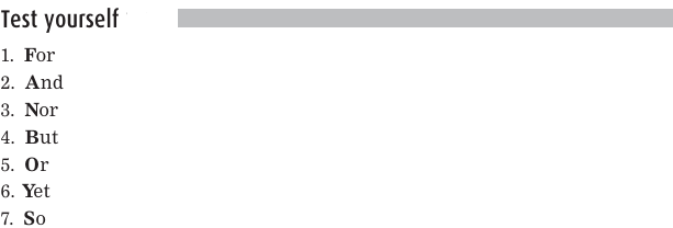 A commonly used way to remember the coordinating conjunctions is to think of FANBOYS: F(for), A (and), N (nor), B (but), O (or), Y (yet), S (so).