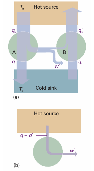 Fig. 3.8 (a) The demonstration of the equivalence of the efficiencies of all reversible engines working between the same thermal reservoirs is based on the f low of energy represented in this diagram. (b) The net effect of the processes is the conversion of heat into work without there being a need for a cold sink: this is contrary to the Kelvin statement of the Second Law.