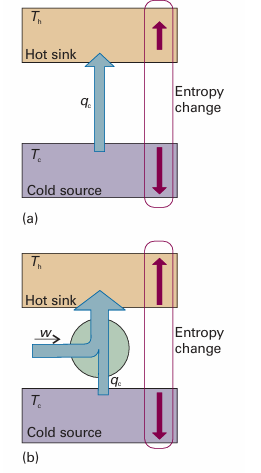 Fig. 3.10 (a) The flow of energy as heat from a cold source to a hot sink is not spontaneous. As shown here, the entropy increase of the hot sink is smaller than the entropy increase of the cold source, so there is a net decrease in entropy. (b) The process becomes feasible if work is provided to add to the energy stream. Then the increase in entropy of the hot sink can be made to cancel the entropy decrease of the hot source.