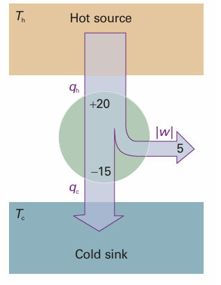 Fig. 3.7 Suppose an energy qh (for example, 20 kJ) is supplied to the engine and qc is lost from the engine (for example, qc =−15 kJ) and discarded into the cold reservoir. The work done by the engine is equal to qh + qc (for example, 20 kJ + (−15 kJ) = 5 kJ). The efficiency is the work done divided by the energy supplied as heat from the hot source.