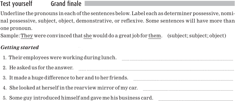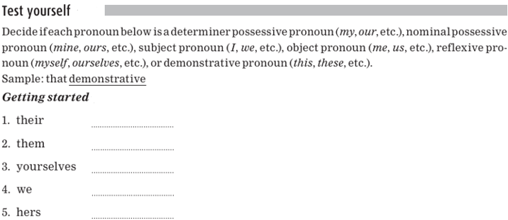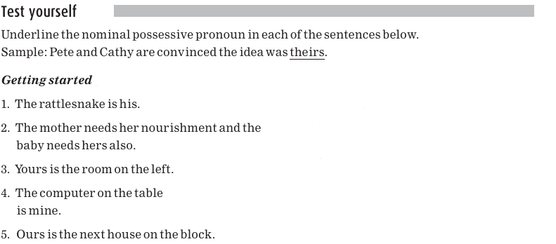 Nominal possessive pronouns replace a whole noun (or noun phrase). For example, instead of saying That book is Sally’s book we can simply say, That book hers. The nominal possessive pronouns are: mine, yours, his, hers, its, ours, theirs.