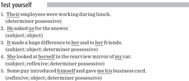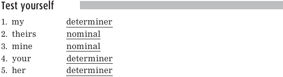Notice that the pronouns his and its can function either as determiner possessive pro nouns or as nominal possessive pronouns.