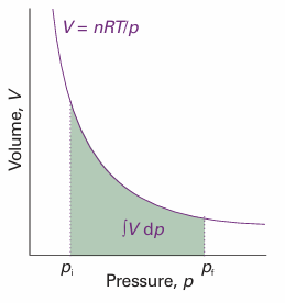 Fig. 3.22 The difference in Gibbs energy for a perfect gas at two pressures is equal to the area shown below the perfect-gas isotherm.