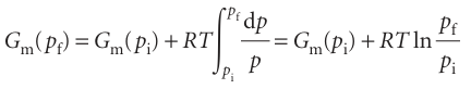This expression shows that when the pressure is increased tenfold at room temperature, the molar Gibbs energy increases by RT ln 10 ≈ 6 kJ mol−1. It also follows from this equation that, if we set pi=p7(the standard pressure of 1 bar), then the molar Gibbs energy of a perfect gas at a pressure p (set pf=p) is related to its standard value by