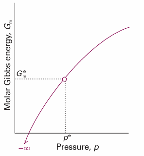 Fig. 3.23The molar Gibbs energy potential of a perfect gas is proportional to ln p, and the standard state is reached at p7. Note that, as p→0, the molar Gibbs energy becomes negatively infinite.