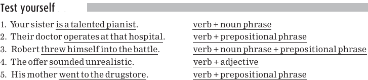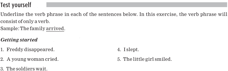 Have you noticed anything that all the underlined verb phrases in sentences 1-5 have in common? Each verb phrase has a verb. In fact, in sentence 1, the verb phrase has nothing in it but a verb, left. A verb phrase may also have other words, as you can see in sentences 2-5, but the least that every verb phrase has to have is a verb.