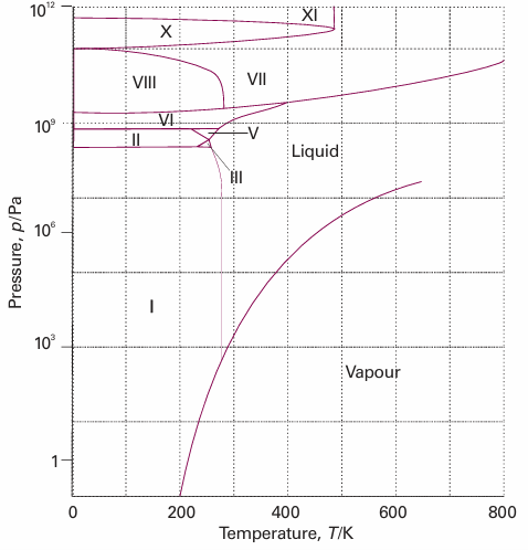 Fig. 4.5The experimental phase diagram for water showing the different solid phases.
