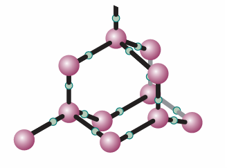 Fig. 4.6A fragment of the structure of ice (ice-I). Each O atom is linked by two covalent bonds to H atoms and by two hydrogen bonds to a neighbouring O atom, in a tetrahedral array.