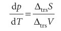 In this expression ∆trsS = Sβ,m − Sα,m and ∆trsV = Vβ,m − Vα,m are the entropy and volume of transition, respectively. The Clapeyron equation is an exact expression for the slope of the phase boundary and applies to any phase equilibrium of any pure sub stance. It implies that we can use thermodynamic data to predict the appearance of phase diagrams and to understand their form. A more practical application is to the prediction of the response of freezing and boiling points to the application of pressure.