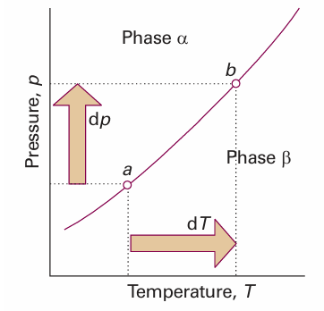 Fig. 4.12 When pressure is applied to a system in which two phases are in equilibrium (at a), the equilibrium is disturbed. It can be restored by changing the temperature, so moving the state of the system to b. It follows that there is a relation between dp and dT that ensures that the system remains in equilibrium as either variable is changed.