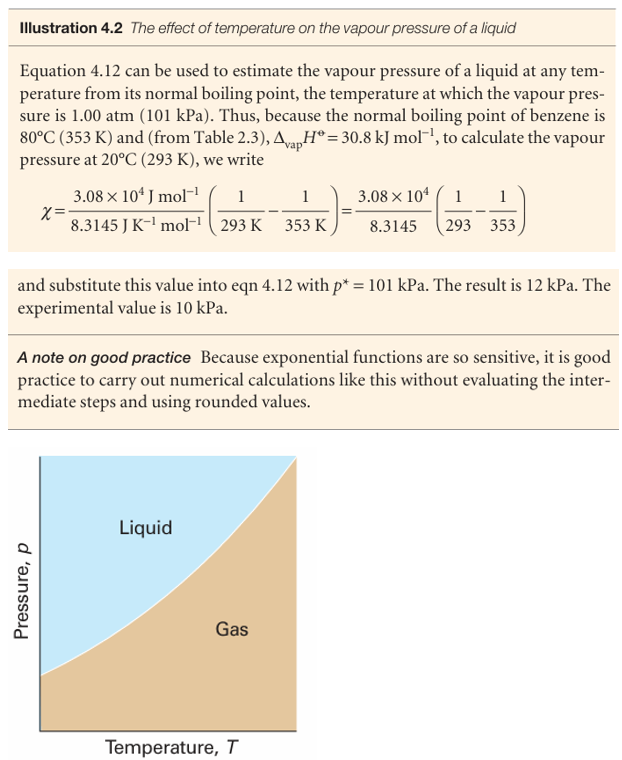 Equation 4.12 is plotted as the liquid–vapour boundary in Fig. 4.14. The line does not extend beyond the critical temperature Tc, because above this temperature the liquid does not exist.