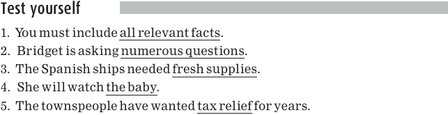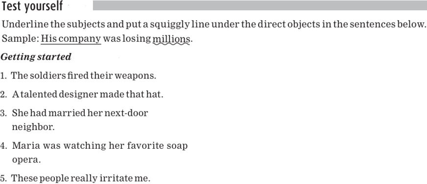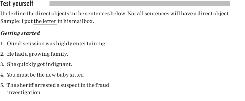 As we saw, a noun phrase can function as the subject of a sentence. A noun phrase can also have other functions. For example, a noun phrase maybe acted upon by the subject and follow the verb. These noun phrases are called direct objects. The direct objects in the sentences below are underlined:
