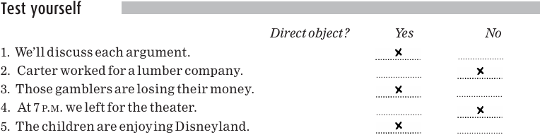 The direct object of a sentence is receiving the action. It can usually be found by answering the question: ‘‘Who or what is being acted upon or receiving the action?’’ The direct object typically occurs immediately after the verb.