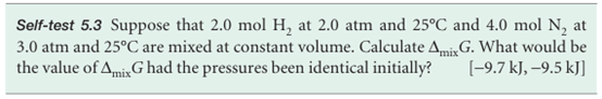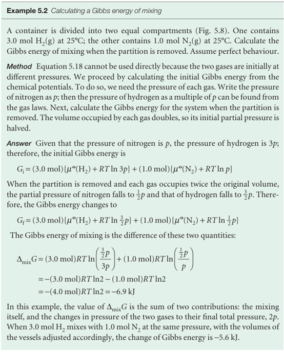 Let the amounts of two perfect gases in the two containers be nA and nB; both are at a temperature T and a pressure p (Fig. 5.6). At this stage, the chemical potentials of the two gases have their ‘pure’ values, which are obtained by applying the definition µ=Gm to eqn 3.57: