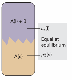 Fig. 5.24The heterogeneous equilibrium involved in the calculation of the lowering of freezing point is between A in the pure solid and A in the mixture, A being the solvent and B a solute that is insoluble in solid A.