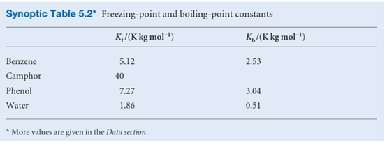 ∆T=Kfb , where Kf is the empirical freezing-point constant (Table 5.2). Once the freezing point constant of a solvent is known, the depression of freezing point may be used to measure the molar mass of a solute in the method known as cryoscopy; however, the technique is of little more than historical interest.