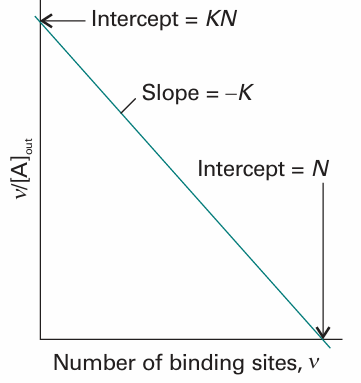 This expression is the Scatchard equation. It implies that a plot of ν/[A]out against v should be a straight line of slope −K and intercept KN at ν = 0 (see Fig. 5.30). From these two quantities, we can find the equilibrium constant for binding and the number of binding sites on each macromolecule. If a straight line is not obtained, we can conclude that the binding sites are not equivalent or independent.