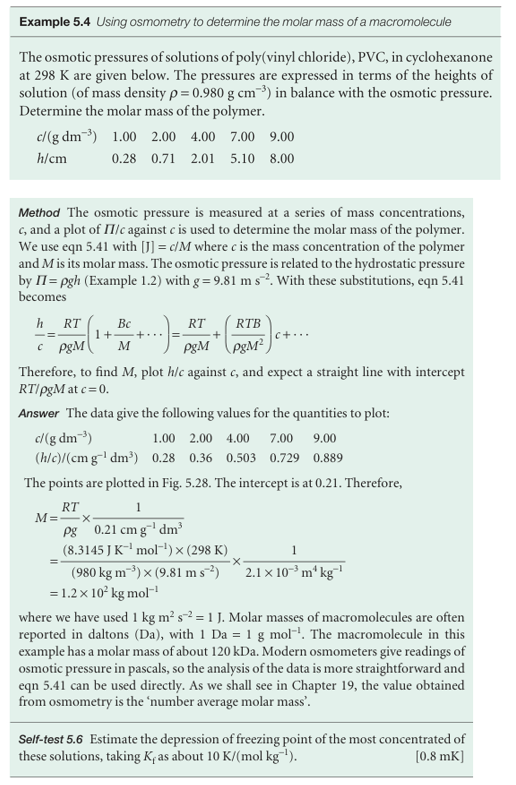 The phenomenon of osmosis (from the Greek word for ‘push’) is the spontaneous passage of a pure solvent into a solution separated from it by a semipermeable mem brane, a membrane permeable to the solvent but not to the solute (Fig. 5.27). The osmotic pressure, Π, is the pressure that must be applied to the solution to stop the influx of solvent. Important examples of osmosis include transport of fluids through cell membranes, dialysis and osmometry, the determination of molar mass by the measurement of osmotic pressure. Osmometry is widely used to determine the molar masses of macromolecules. In the simple arrangement shown in Fig. 5.28, the opposing pressure arises from the head of solution that the osmosis itself produces. Equilibrium is reached when the hydrostatic pressure of the column of solution matches the osmotic pressure. The complicating feature of this arrangement is that the entry of solvent into the solution results in its dilution, and so it is more difficult to treat than the arrangement in Fig. 5.27, in which there is no flow and the concentrations remain unchanged. The thermodynamic treatment of osmosis depends on noting that, at equilibrium, the chemical potential of the solvent must be the same on each side of the membrane. The chemical potential of the solvent is lowered by the solute, but is restored to its ‘pure’ value by the application of pressure. As shown in the Justification below, this equality implies that for dilute solutions the osmotic pressure is given by the van ’t Hoff equation:
