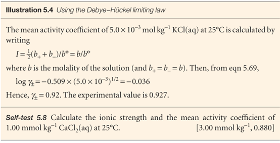 The name ‘limiting law’ is applied to eqn 5.69 because ionic solutions of moderate molalities may have activity coefficients that differ from the values given by this expression, yet all solutions are expected to conform as b → 0. Table 5.5 lists some experimental values of activity coefficients for salts of various valence types.
