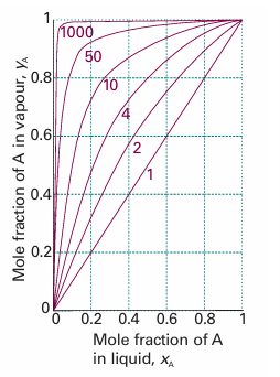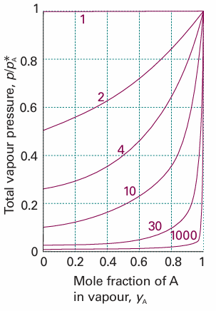 Figure 6.7 shows the composition of the vapour plotted against the composition of the liquid for various values of p* A/p* B> 1. We see that in all cases yA> xA, that is, the vapour is richer than the liquid in the more volatile component. Note that if B is non-volatile, so that p* B = 0 at the temperature of interest, then it makes no contribution to the vapour (yB= 0).