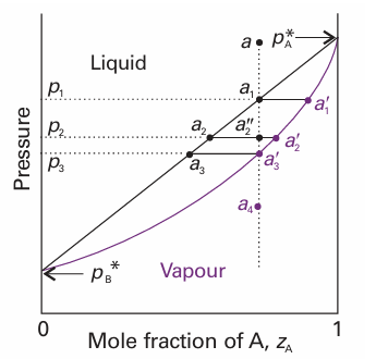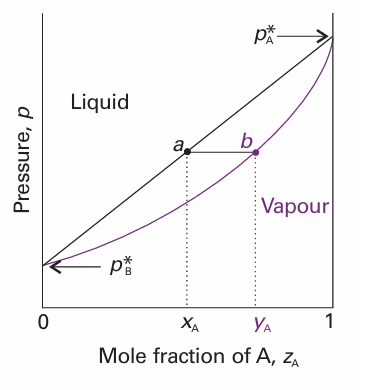 Fig. 6.9 The dependence of the total vapour pressure of an ideal solution on the mole fraction of A in the entire system. A point between the two lines corresponds to both liquid and vapour being present; outside that region there is only one phase present. The mole fraction of A is denoted zA, as explained below.
