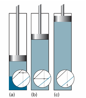 Fig. 6.11 (a) A liquid in a container exists in equilibrium with its vapour. The superimposed fragment of the phase diagram shows the compositions of the two phases and their abundances (by the lever rule). (b) When the pressure is changed by drawing out a piston, the compositions of the phases adjust as shown by the tie line in the phase diagram. (c) When the piston is pulled so far out that all the liquid has vaporized and only the vapour is present, the pressure falls as the piston is withdrawn and the point on the phase diagram moves into the one-phase region.