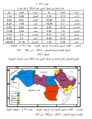 تنتشر تربية النحل في اغلب الدول العربية وذلك لتوفر متطلبات التربية من مناخ وموارد مائية ونباتات طبيعية ومحاصيل زراعية وغيرها من العوامل البيئية والبشرية ، وقد بلغ إنتاج العسل في الوطن العربي لعام 2014 حوالي (31.2) الف طن ، وقد تصدرت الجزائر المرتبة الأولى بواقع إنتاج قدره (5.7) الف طن وشكل نسبة قدرها (183) من الإنتاج العربي، واحتلت مصر والمغرب المرتبتين الثانية والثالثة بواقع إنتاجي قدره (5.44 ، 5.3) الف طن وبنشبة إنتاج قدرها (17.5) ، 17 % من الإنتاج العربي ودرجة معيارية قدرها (1.71 ، 1.64) على التوالي ، جدول (18) خريطة (10).