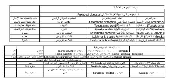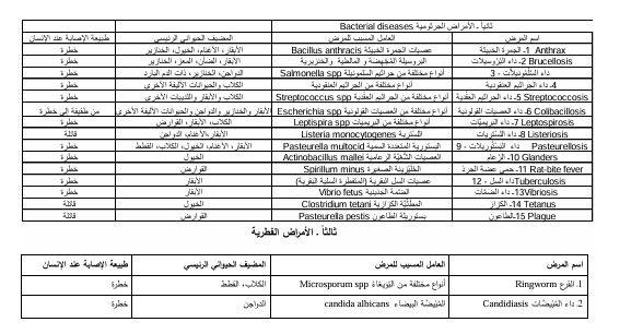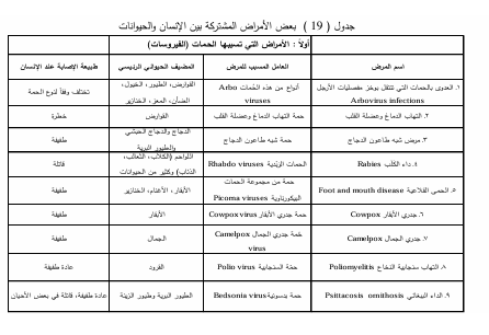 3- الامراض المشتركة : تنتشر كثير من الامراض المشتركة بين الانسان والحيوان والتي لامجال لدراستها في هذا الكتاب ويمكن عرضها في الجدول (19) للاطلاع عليها او استكمال بعض الباحثين لهذه الدراسة في المستقبل القريب ولدراسة الامراض التي تصيب الثروة الحيوانية في الوطن العربي لابد من التعرف أولاً على اهم الامراض العامة التي تصيب الثروة الحيوانية ، ثم نعرج ثانياً على دراسة الامراض الاكثر انتشاراً بين الحيوانات في الوطن العربي.