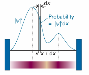 Fig. 8.19 The wavefunction ψ is a probability amplitude in the sense that its square modulus (ψ*ψ or |ψ|2) is a probability density. The probability of finding a particle in the region dx located at x is proportional to |ψ|2dx. We represent the probability density by the density of shading in the superimposed band.